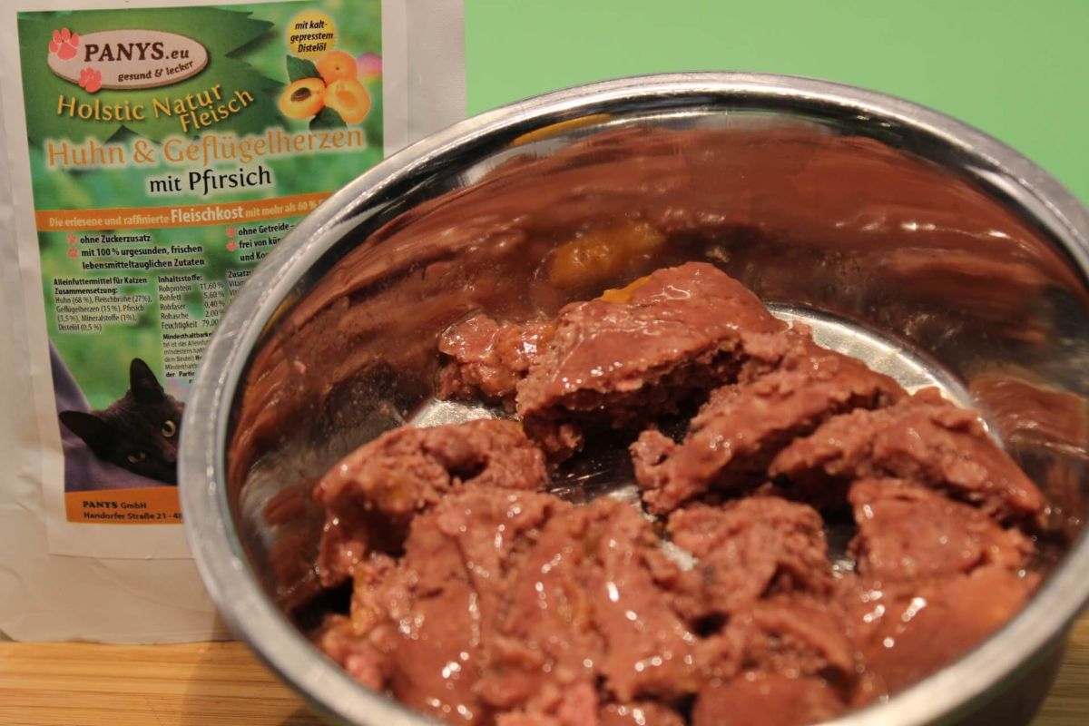 Hühnchen, Geflügelherzen & Pfirsich für Magen-Darm sensible Katzen bestens geeignet. Der Fleischanteil von insgesamt 68,0 % besteht nur aus Huhn und Geflügelherzen, sowie Fleischbrühe nur vom Geflügel (also kein Rind etc. enthalten).