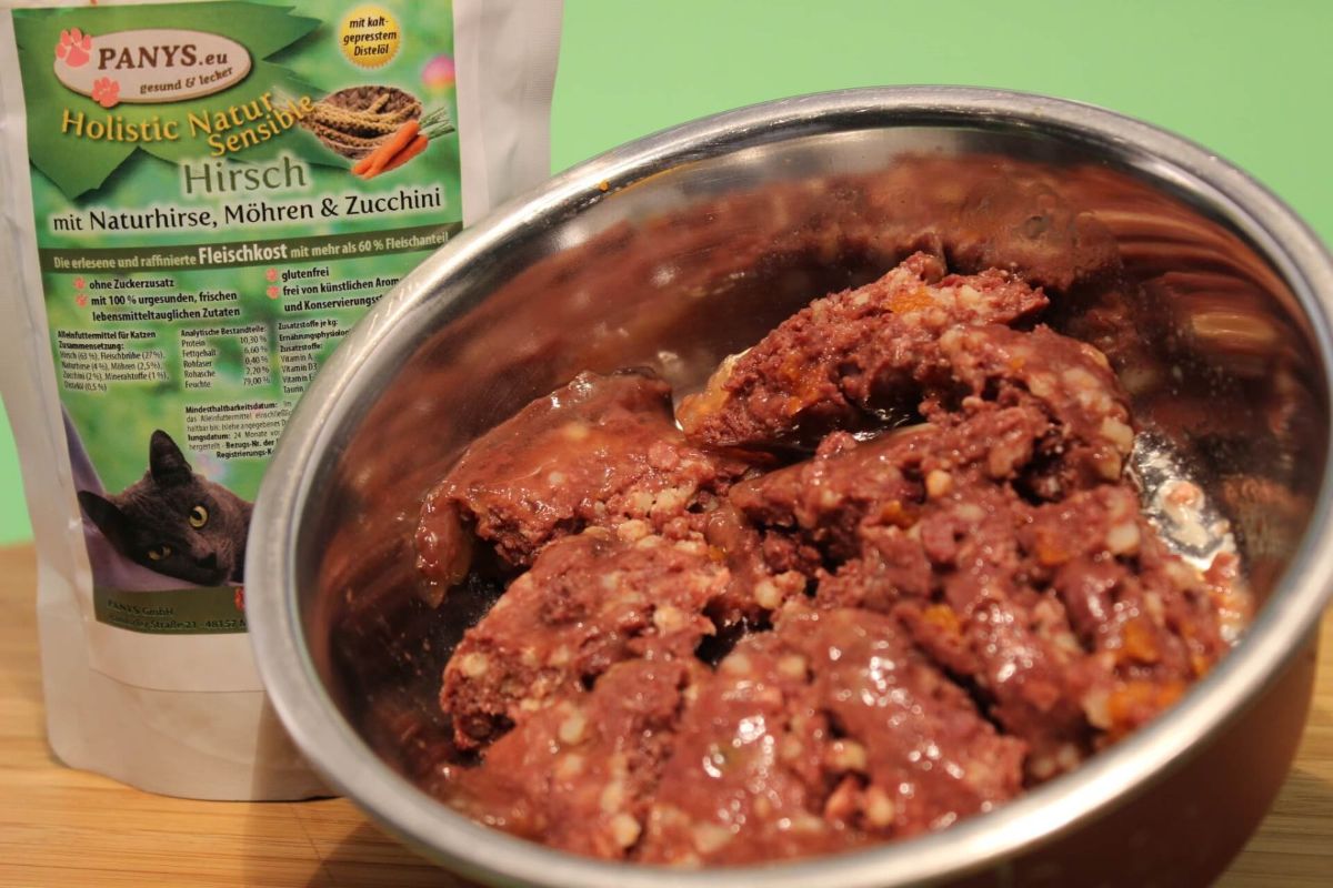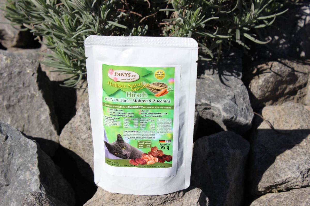 ist ein Alleinfuttermittel für ausgewachsene Katzen mit 63,0 % Fleischanteil vom Hirsch. Super geeignet für alle die kein Geflügel vertragen. Nur 4,0 % Kohlenhydrate in Form von Hirse, also auch hier wieder eine glutenfreie Rezeptur. 2,5 % Möhren und 2,0 % Zucchini sind reich an Vitaminen nicht nur gut für die Augen.
