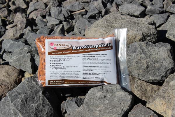 PANYS Karottenpellets sind ein wertvoller Vitamin-, Mineralstoff- und Spurenelemente-Spender. Zusammensetzung: Karotten (Möhren) (davon mind. 100%) werden aus stark karotinhaltigen roten Mohrrüben hergestellt und sind ein 100%iges Naturprodukt. 100g Karottenpellets enthalten 50mg Karotin (Vorstufe zu Vitamin A) und entsprechen 1kg frische Möhren. Außerdem enthalten sie viel Vitamin B. Nach einer Wurmkur kann der Wideraufbau der Darmflora durch Karottenpellets positiv unterstützt werden.