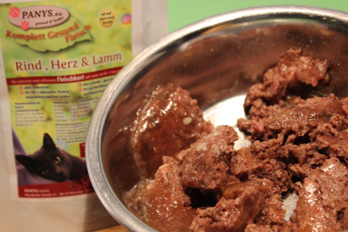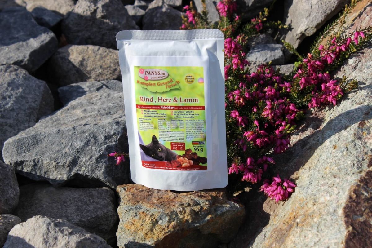 Die PANYS Fleischmahlzeit - Rind, Herz und Lamm... ist ohne Zuckerzusatz und 100 % natürlichen sowie aus frischen lebensmitteltauglichen Zutaten. Deutsche Qualität ohne zugesetzte künstliche Aroma- und Farbstoffe mit kaltgepresstem Distelöl.